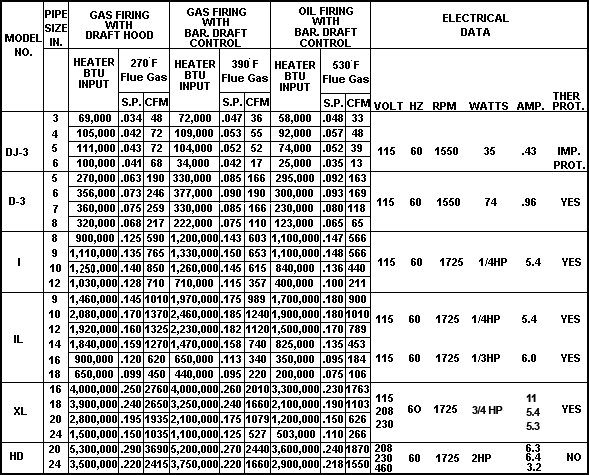 Inputs shown above are believed to be maximum capacities for inducers, when mounted on pipe sizes shown for ordinary jobs where a moderate amount of mechanical induced draft is required.
